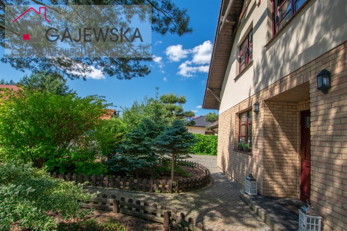 Dom słoneczny, otoczony zielenią, murowany w systemie tradycyjnym z 2011 roku, o ciekawej bryle z przestronnym tarasem, wyposażony w panele fotowoltaiczne oraz system alarmowy.