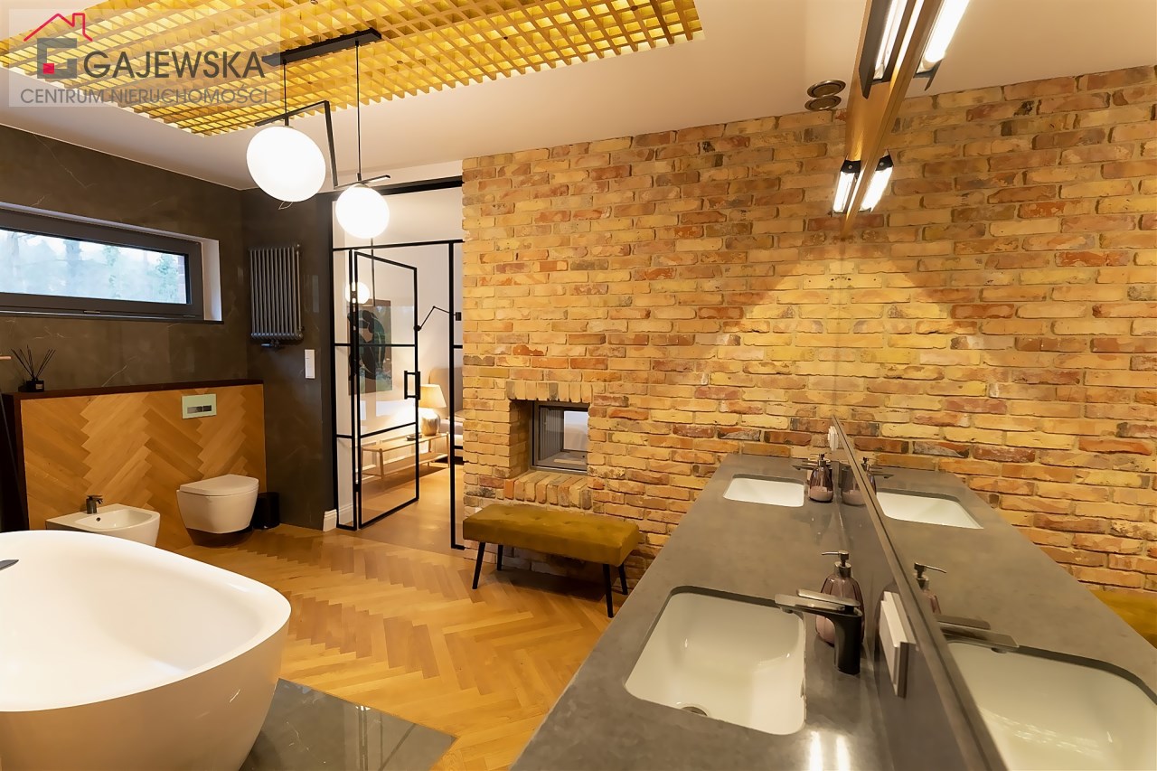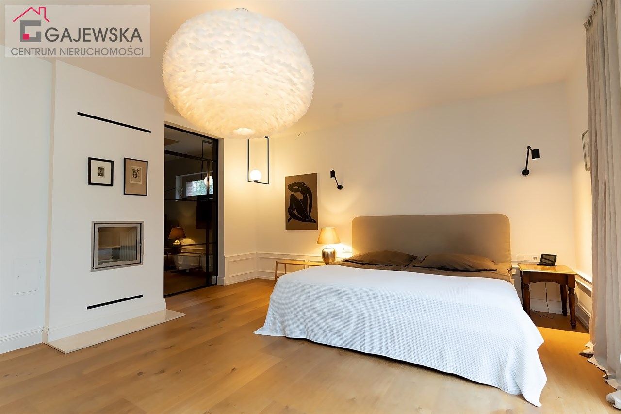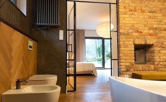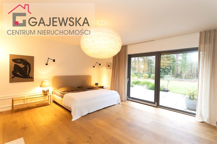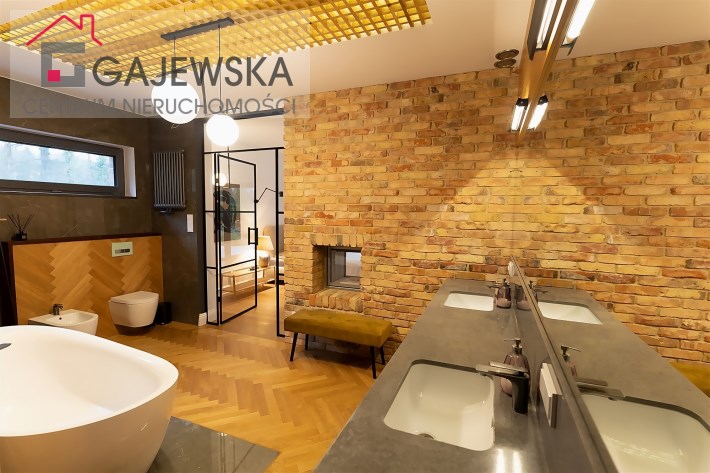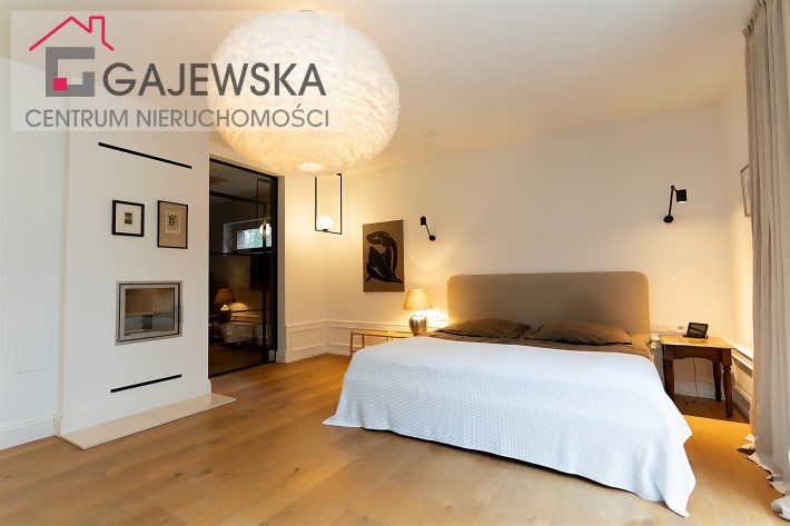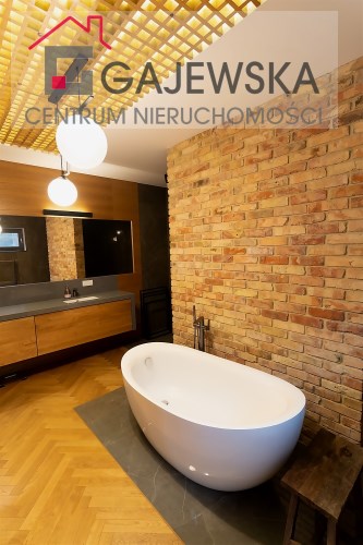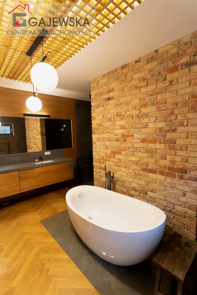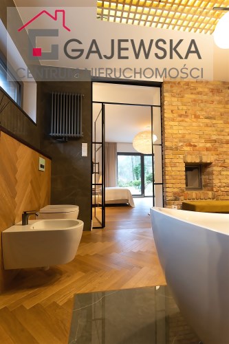 Wyjątkowa sypialnia z pokojem kąpielowym. Duża sypialnia z widokiem na ogród i wyjściem na taras na którym poranili z kawą są wyjątkowe. Pokój kąpielowy z gustowna wanna wolnostojącą i częścią z natryskiem. Pokój kąpielowy z dużymi lustrami, elementami drewna i stylowej cegły