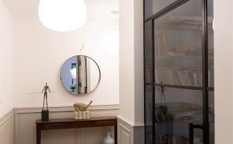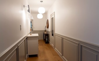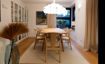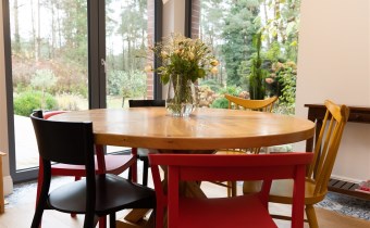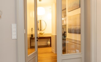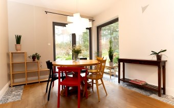 Do kolejnej części domu prowadzą nas z kuchni z jadalnią stylowe drewniane drzwi z dużym przeszkleniem za którymi znajdują się: