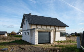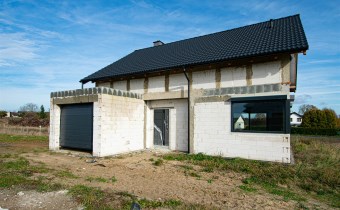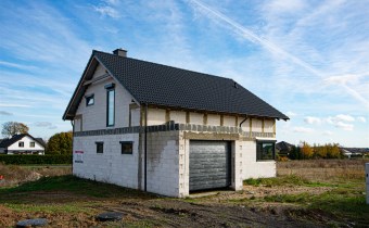 Dom z zamontowanymi oknami 3 szybowymi, z roletami zewnętrznymi (sterowanymi automatycznie), drzwiami zewnętrznymi oraz uchylną bramą garażową.