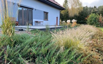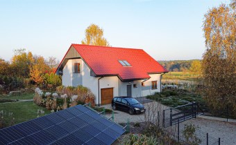 Dom został zaprojektowany z myślą o maksymalnej wygodzie mieszkańców. Dzięki zastosowaniu nowoczesnych technologii, takich jak pompa ciepła i panele fotowoltaiczne, zapewnia bardzo niskie koszty utrzymania. Dodatkowym atutem jest wysokiej jakości docieplenie budynku oraz garaż w bryle domu, co czyni go idealnym dla osób ceniących funkcjonalność i oszczędność.