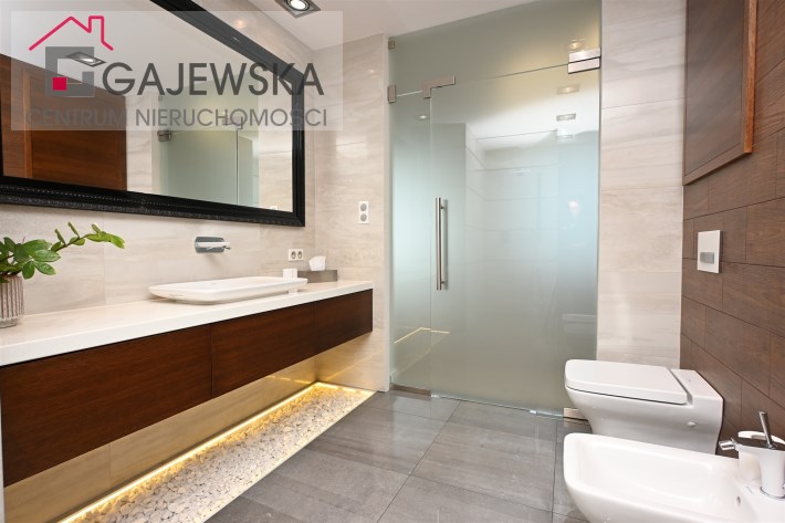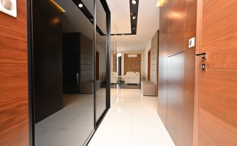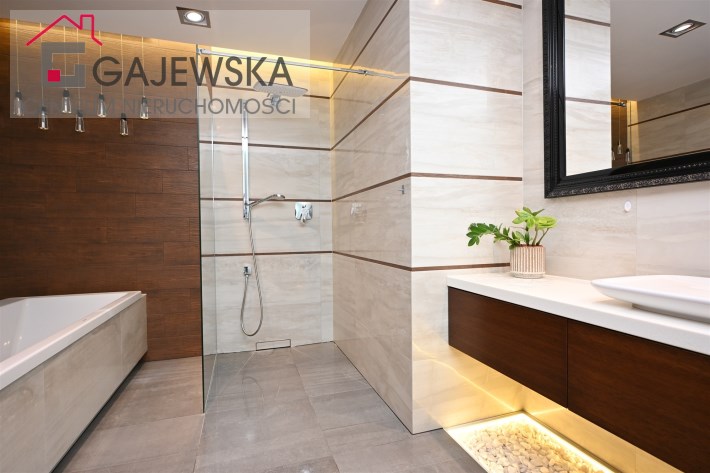 płytami imitującymi naturalne drewno, a także imponujące lustra, co nadaje wnętrzu elegancki i spójny charakter.