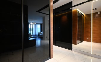 W całym apartamencie wykonano zabudowy na wymiar — od mebli po dekoracyjne zabudowy ścian