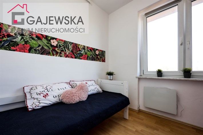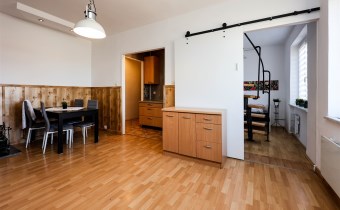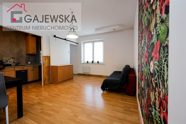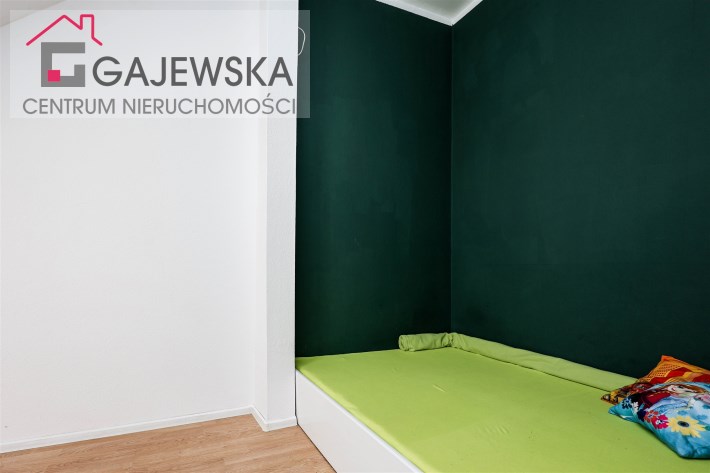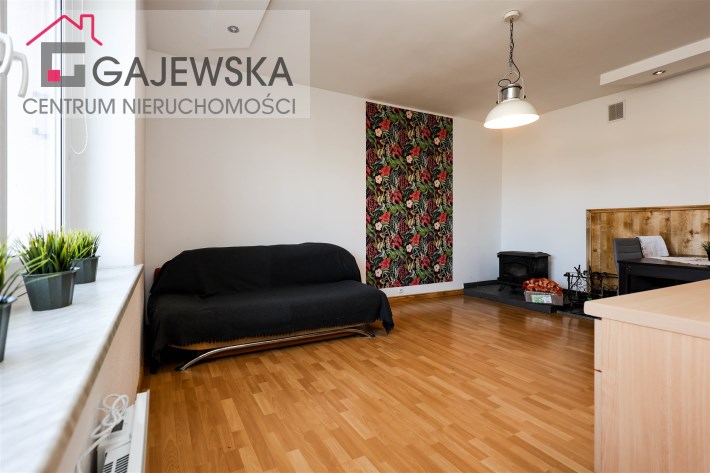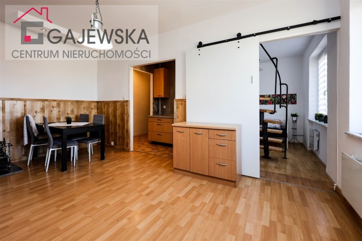 kuchnię, łazienki i korytarza. Salon oddzielony od strefy sypialnej przesuwnymi, nowoczesnymi drzwiami. Na górze