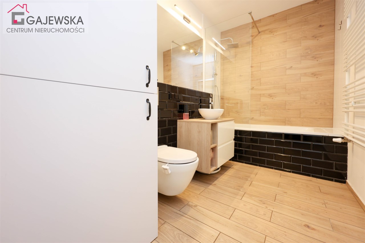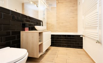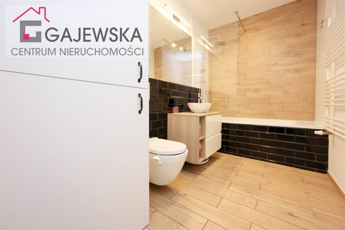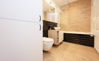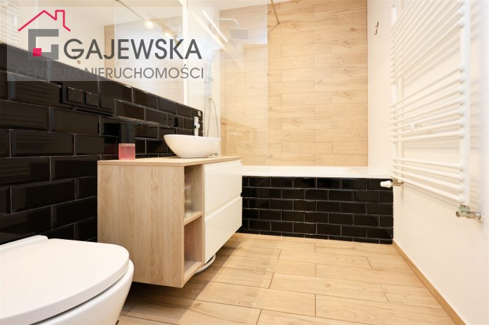 Łazienka została urządzona w stylowy i ponadczasowy sposób. Znajduje się w niej wanna wyposażona w praktyczny, szklany parawan, co łączy funkcjonalność kąpieli i prysznica w jednym rozwiązaniu.