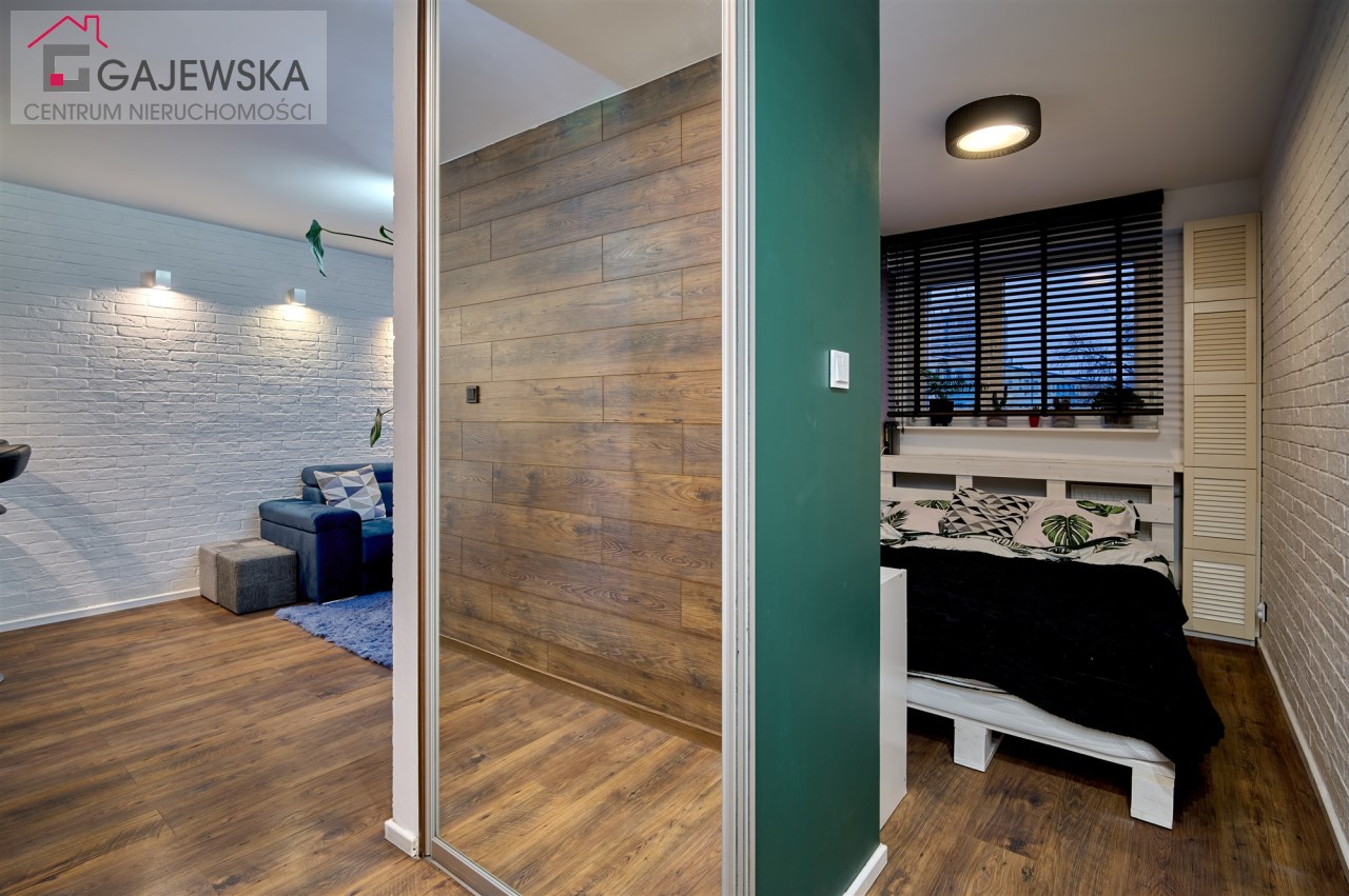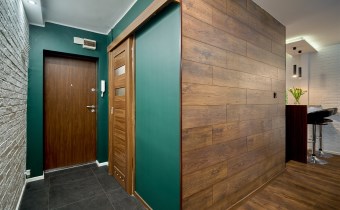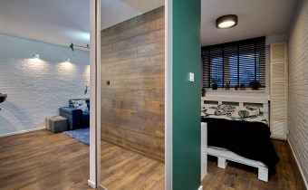 Lustro optycznie powiększa przestrzeń, a jednocześnie dyskretnie ukrywa wejście do sypialni, nadając wnętrzu nowoczesny charakter.