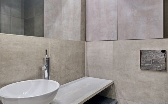 Łazienka została wykończona w surowym, nowoczesnym stylu inspirowanym betonem architektonicznym.