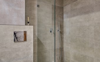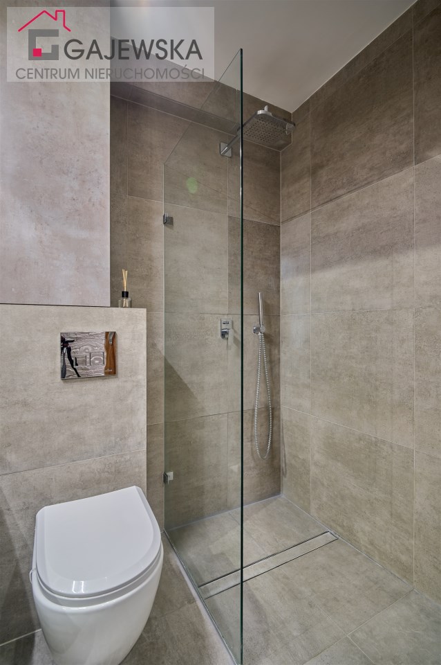 Znajdziesz tu prysznic typu walk-in z odpływem liniowym oraz WC na stelażu typu Geberit.