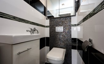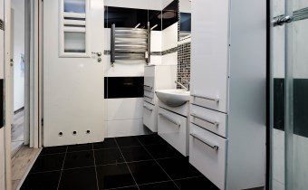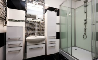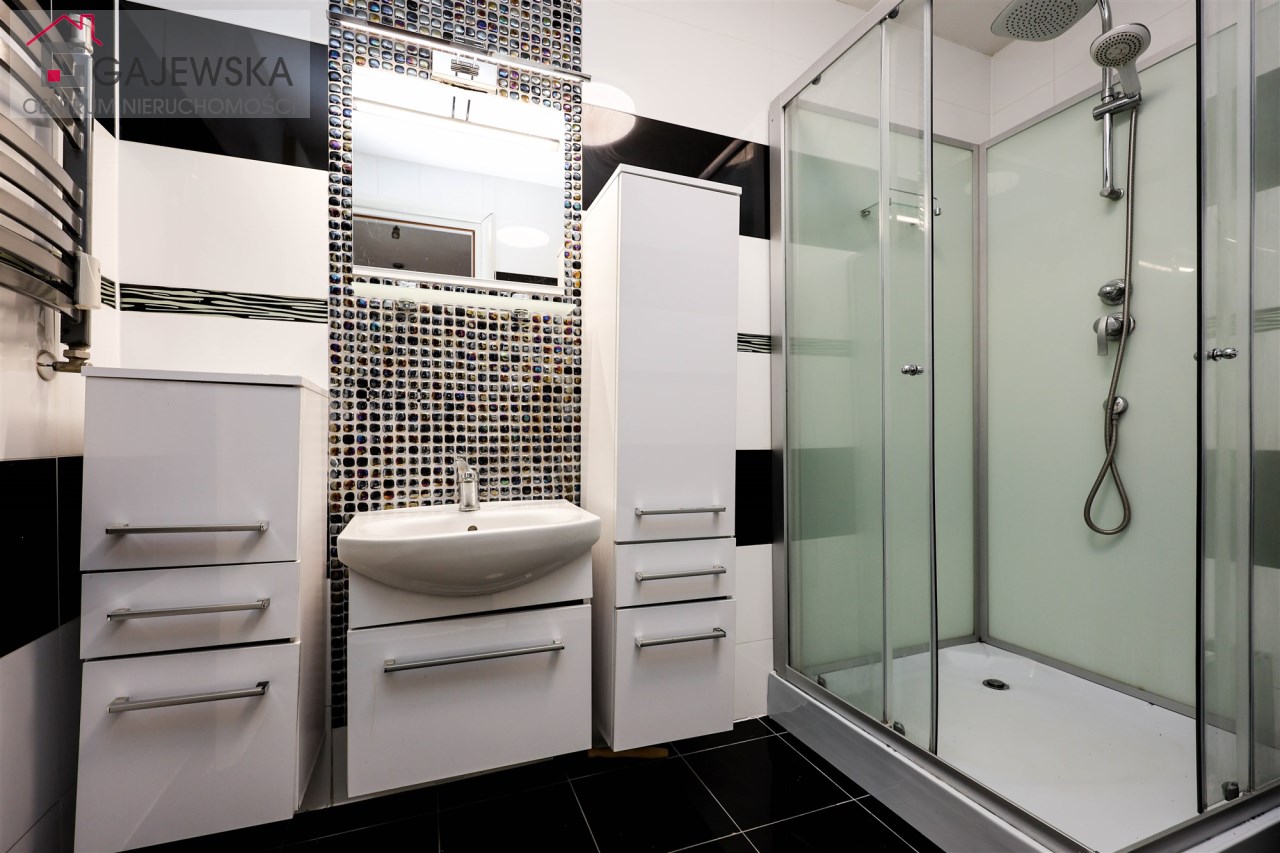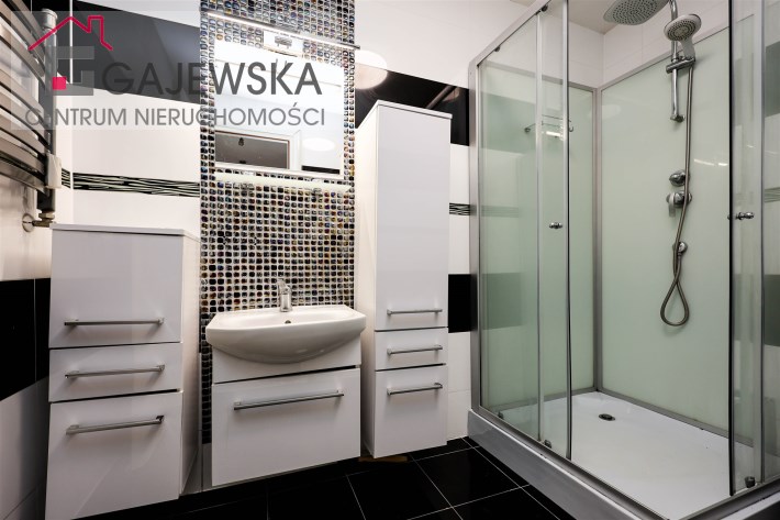 łazienka z dużym prysznicem, miejscem na pralkę i suszarkę, tutaj nowoczesność łączy się z wygodą, oddzielne wc z umywalką,