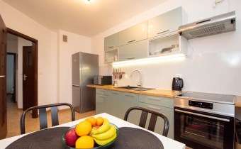 - przestronna kuchnia o powierzchni 10,36 m2  wyposażona w piekarnik, lodówkę, zamrażarkę, płytę elektryczną oraz meble kuchenne.