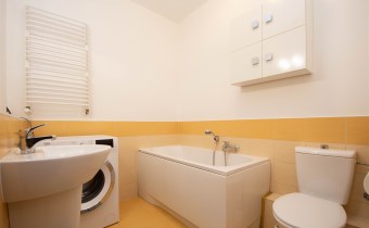 - łazienka o powierzchni 4,08 mwyposażona w pralkę, toaletę, szafkę, lustro oraz wannę