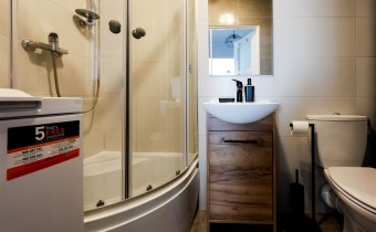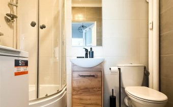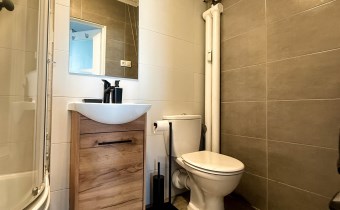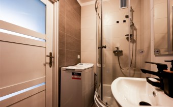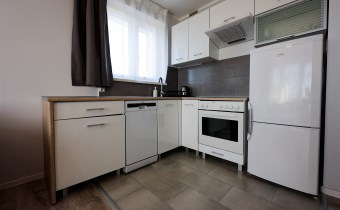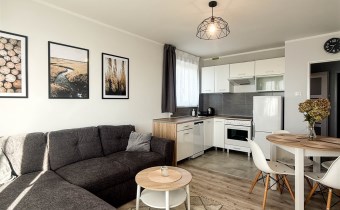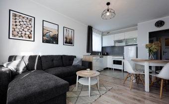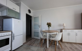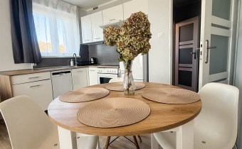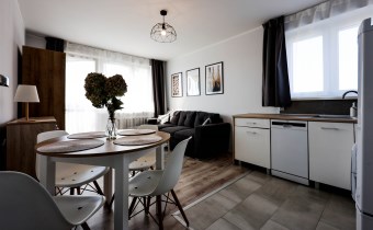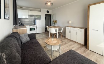 - przestronny salon z aneksem kuchennym, w pełni wyposażony: rozkładana kanapa, stolik, szafa, komoda, stół z krzesłami, kuchnia z dużą ilością szafek, zmywarką, lodówką, piekarnikiem i płytą elektryczną, z salonu wyjście na balkon,