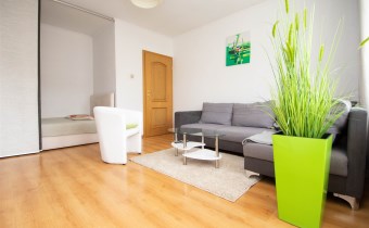 - salon z wydzielonym miejscem na łóżko sypialniane oraz wyjściem na balkon