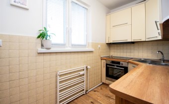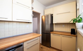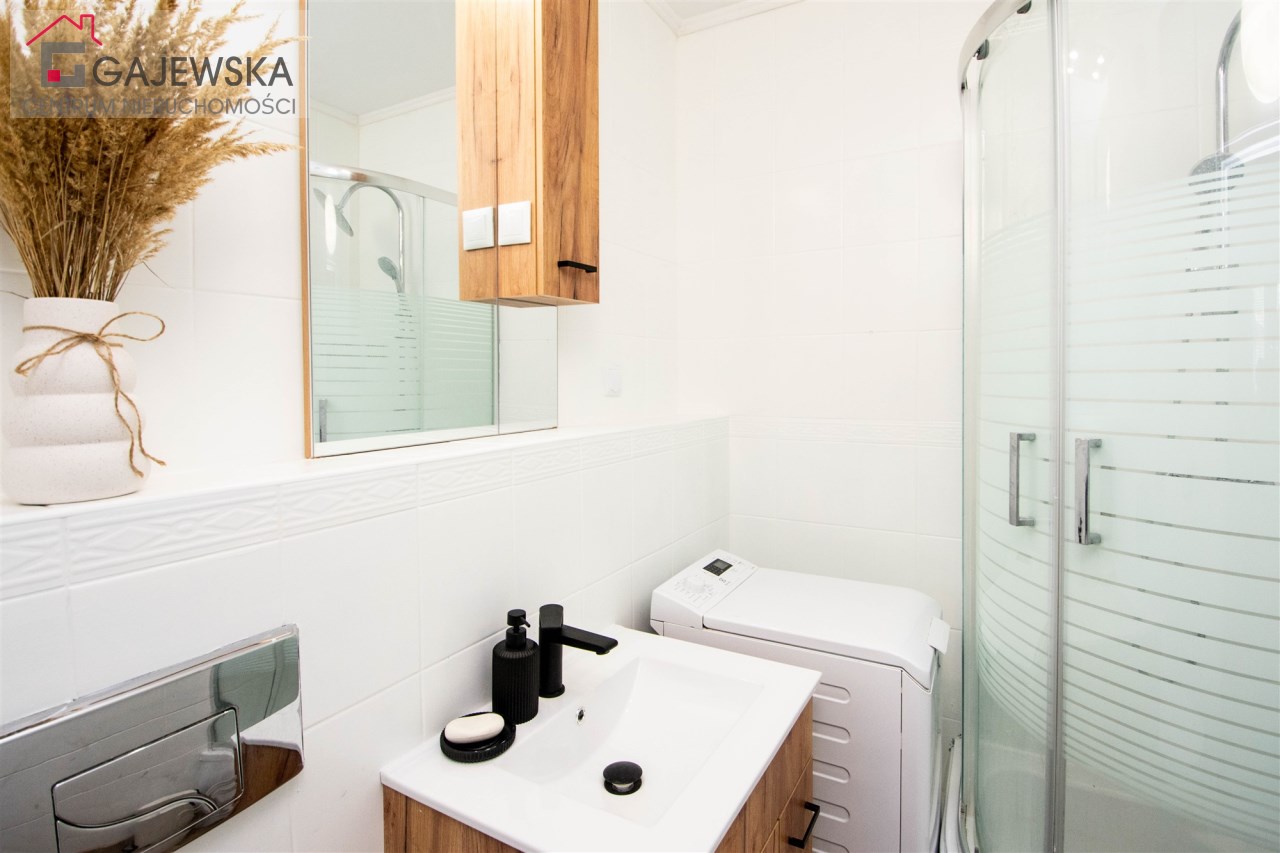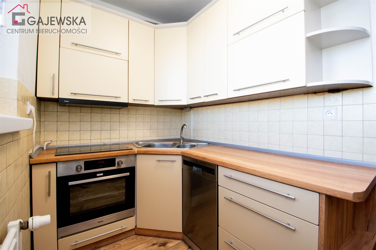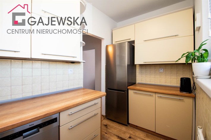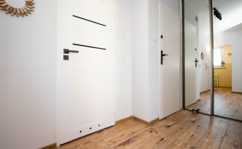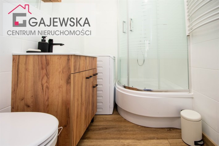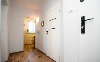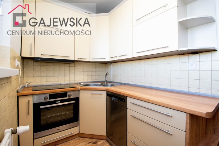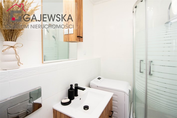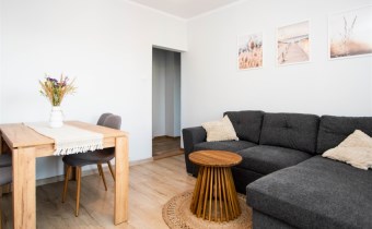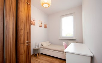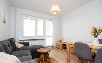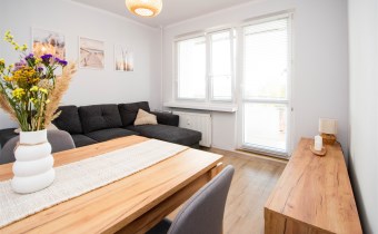 Z jasnego salonu wyjście na balkon, znalazło się tutaj miejsce na kanapę z funkcją spania, stół z 4 krzesłami, szafka pod TV i stolik kawowy. Przytulna sypialnia, w której znajduje się szafa w zabudowie, łózko oraz biurko z krzesłem. Oddzielna kuchnia z oknem, z dużą ilością szafek i szuflad, lodówką, zmywarką, piekarnikiem i płytą indukcyjną. Łazienka z prysznicem.
