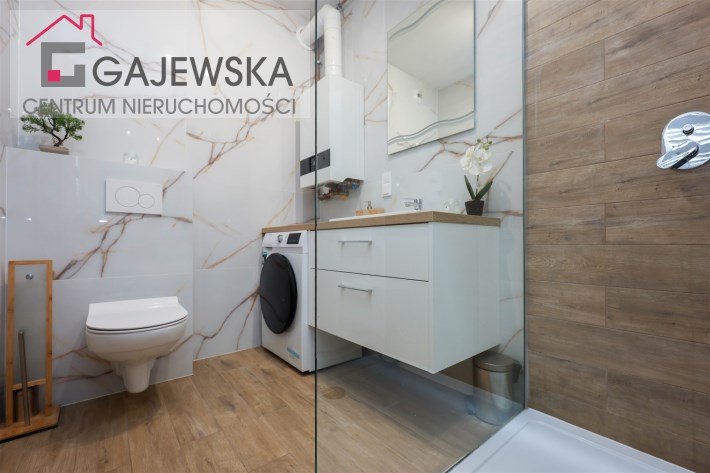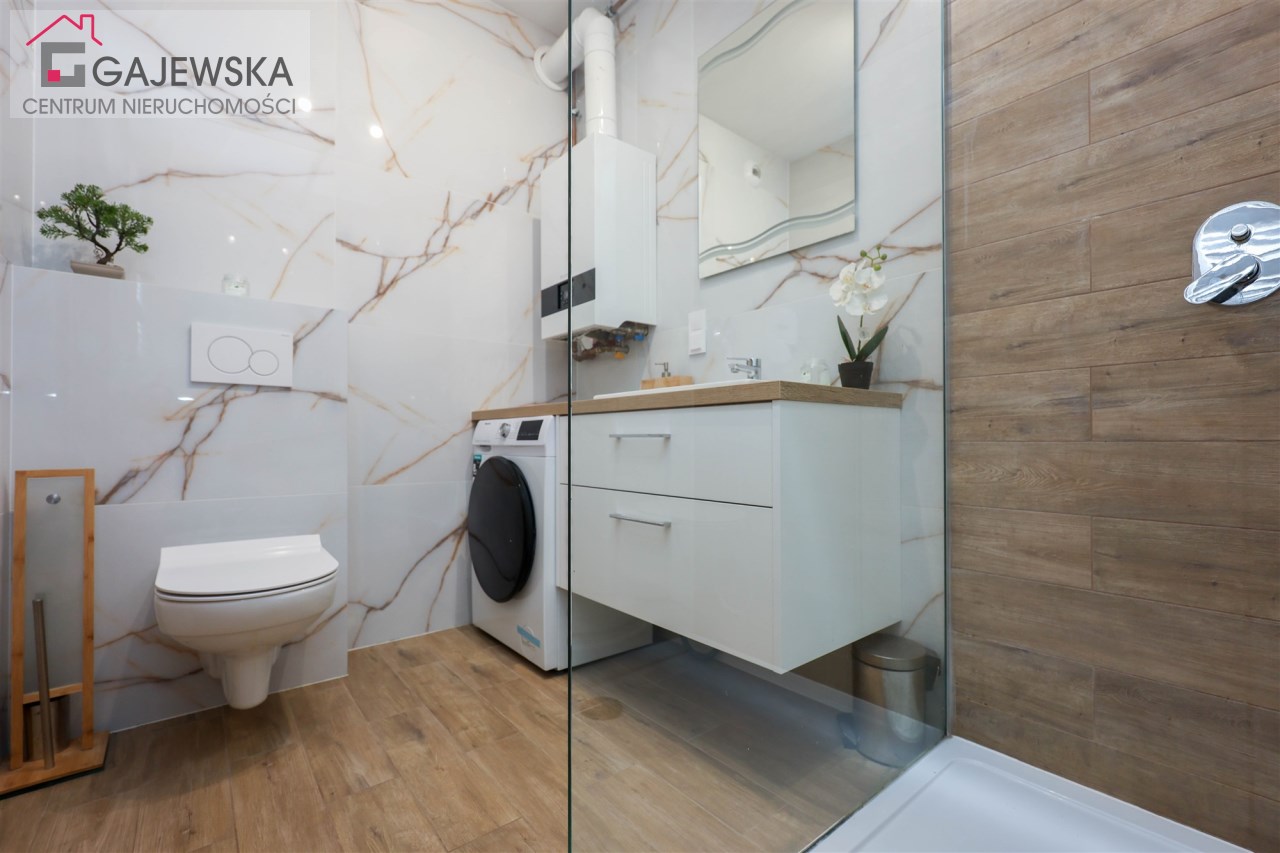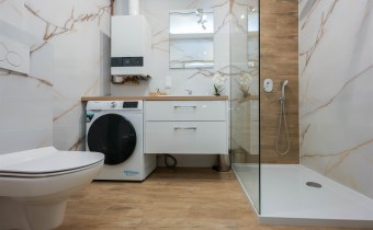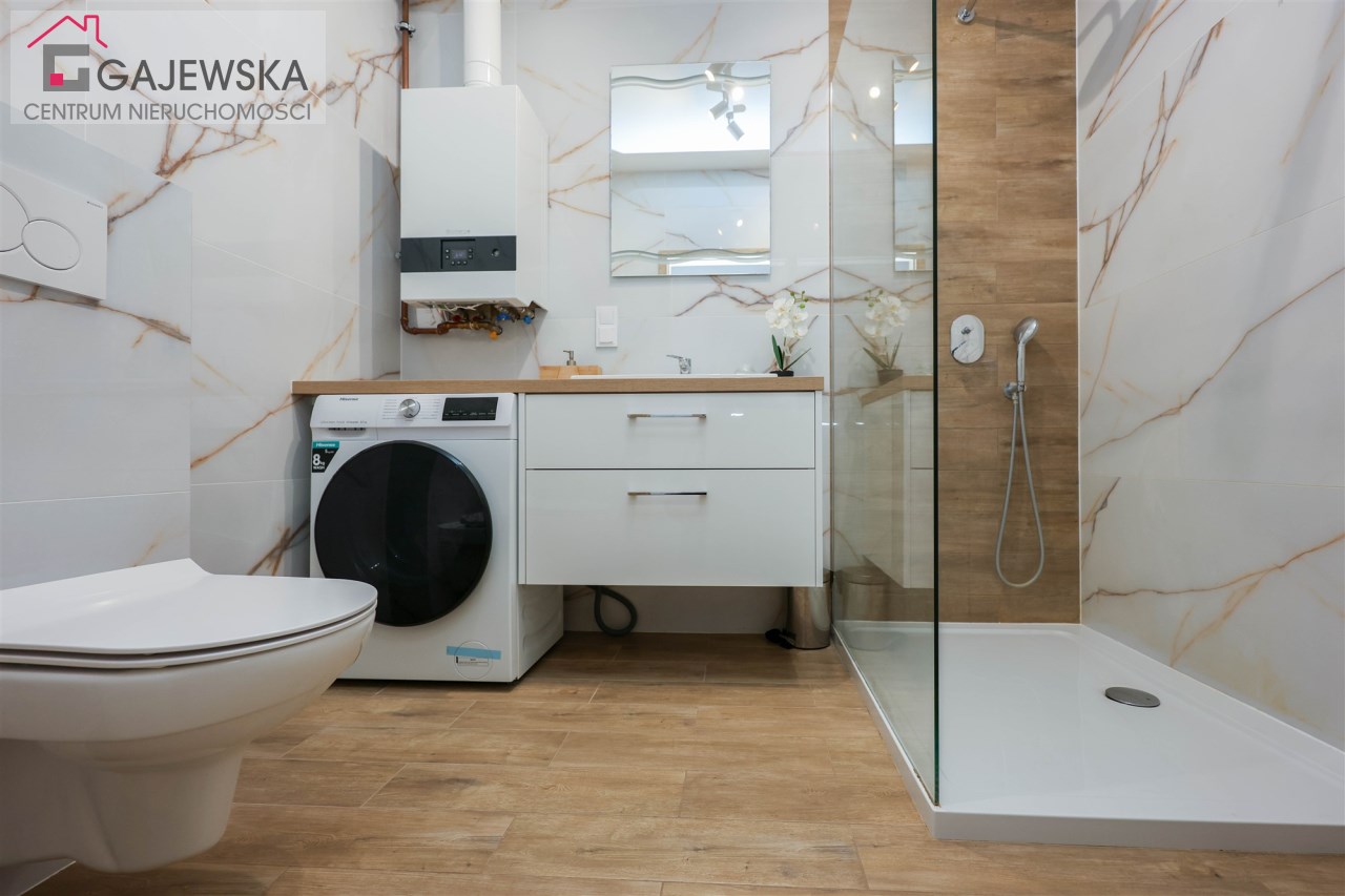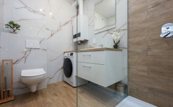 Łazienka o powierzchni 4,63 m2– nowoczesna i stylowa przestrzeń z kabiną prysznicową oraz WC. W pomieszczeniu znajduje się pralka oraz piecyk gazowy dwufunkcyjny.
