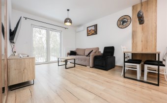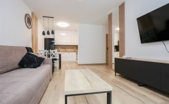 Salon z aneksem kuchennym i jadalnią o powierzchni 22,6 m2– przestrzeń dzienna zaprojektowana z myślą o komforcie- wygodna kanapa, telewizor, klimatyzacja oraz fotel z funkcją "relaks". Kuchnia w pełni wyposażona w niezbędne sprzęty AGD takie jak lodówko- zamrażarka, zmywarka oraz piekarnik elektryczny. W części jadalnianej stół z krzesłami.