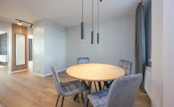 - pokój z aneksem kuchennym o powierzchni 14,60m2 wyposażony w stół i 4 krzesła, aneks kuchenny ze sprzętem AGD ( płyta grzewcza, okap, piekarnik, zmywarka, lodówko-zamrażarka)