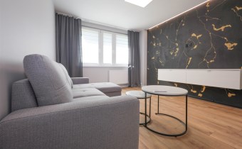 - sypialnia o powierzchni 13,60 m2 wyposażona w narożnik z funkcją spania, szafkę RTV oraz stoliki kawowe