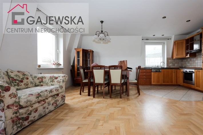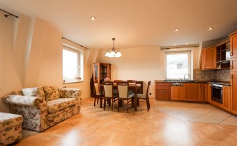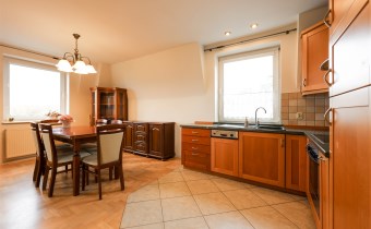 - salon z aneksem kuchennym oraz jadalnią. Meble kuchenne wraz ze sprzętem AGD. W salonie kanapa z funkcją spania. W części jadalnianej stół z krzesłami oraz komoda i witrynka.