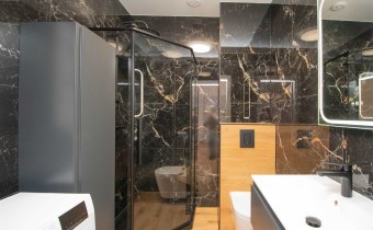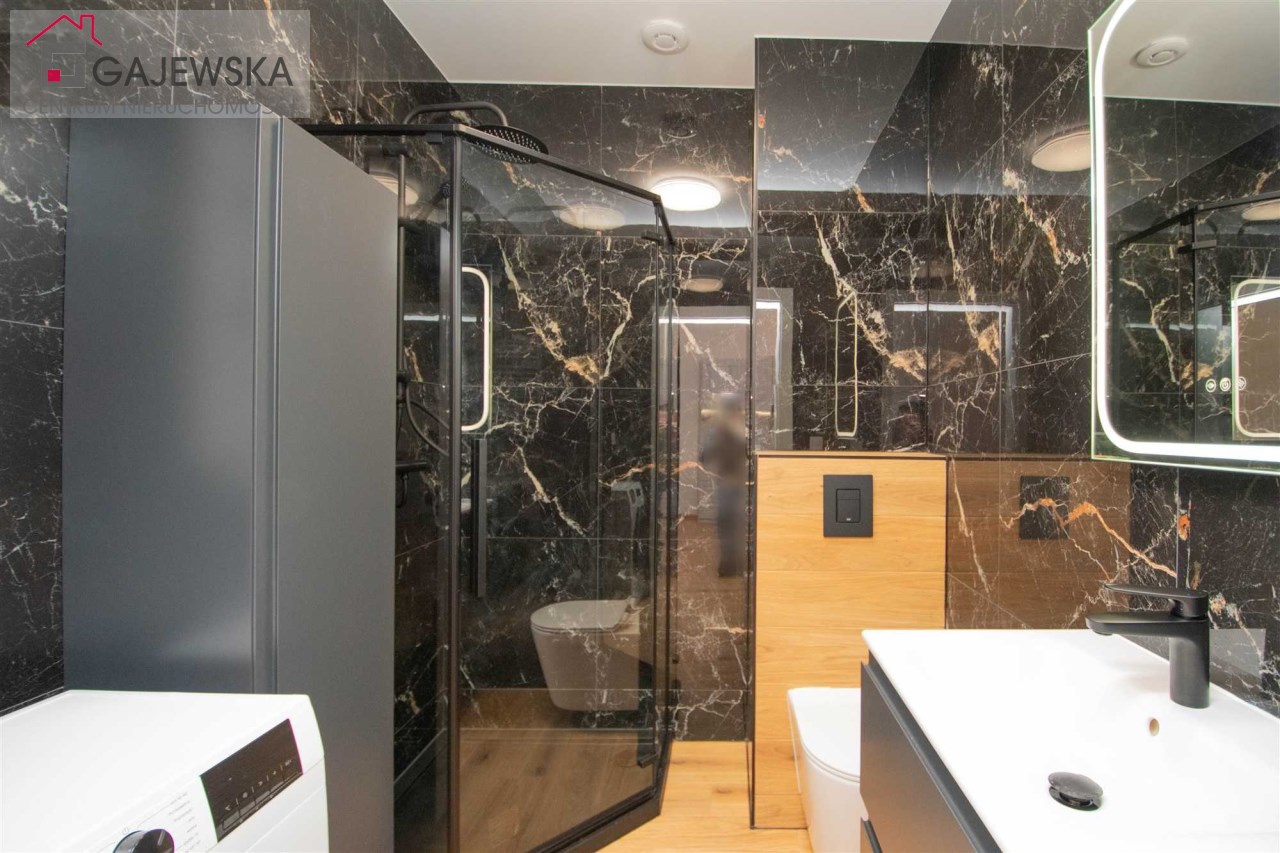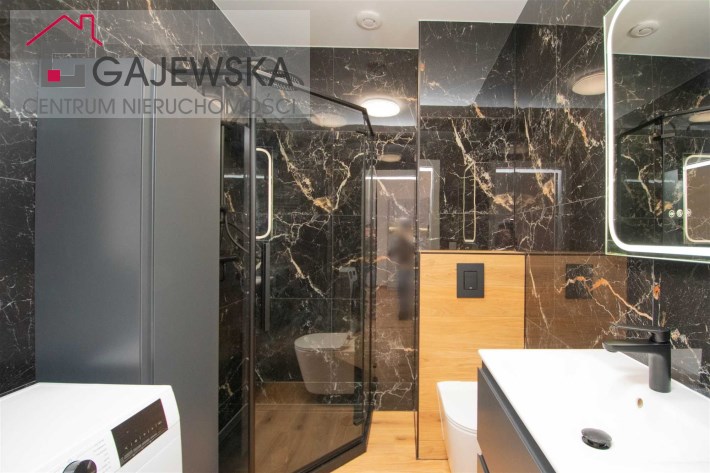 Łazienka wyposażona w kabinę prysznicową, toaletę, szafkę z umywalką, lustro oraz pralkę.